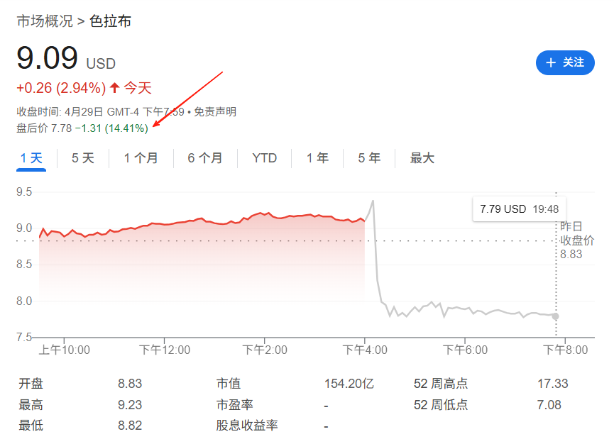 音问公布之后,Snap股价盘后一度重挫16%,现跌超14%。